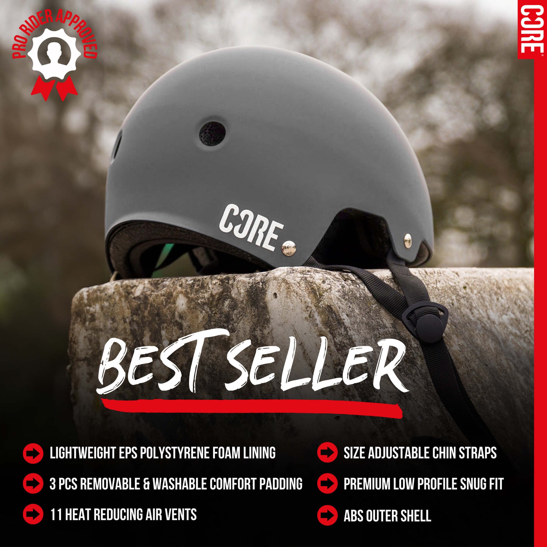 Alle CORE-Helme sind aus einem leicht stoßabsorbierenden Material namens EPS (expandiertes Polystyrol) hergestellt. Es ist so konzipiert, dass es bei starken Stößen komprimiert wird, bricht und reißt, damit Ihr Kopf nicht beschädigt wird! Ihr Helm ist nicht dafür ausgelegt, mehreren schweren Stößen standzuhalten, und Sie MÜSSEN Ihren Helm nach einem schweren Aufprall ersetzen. Obwohl das Äußere des Helms von außen vollkommen in Ordnung aussehen kann, kann die EPS-Struktur nach einem schweren Aufprall beschädigt sein. Bitte ersetzen Sie Ihren Helm nach einem schweren Aufprall zu Ihrer eigenen Sicherheit.